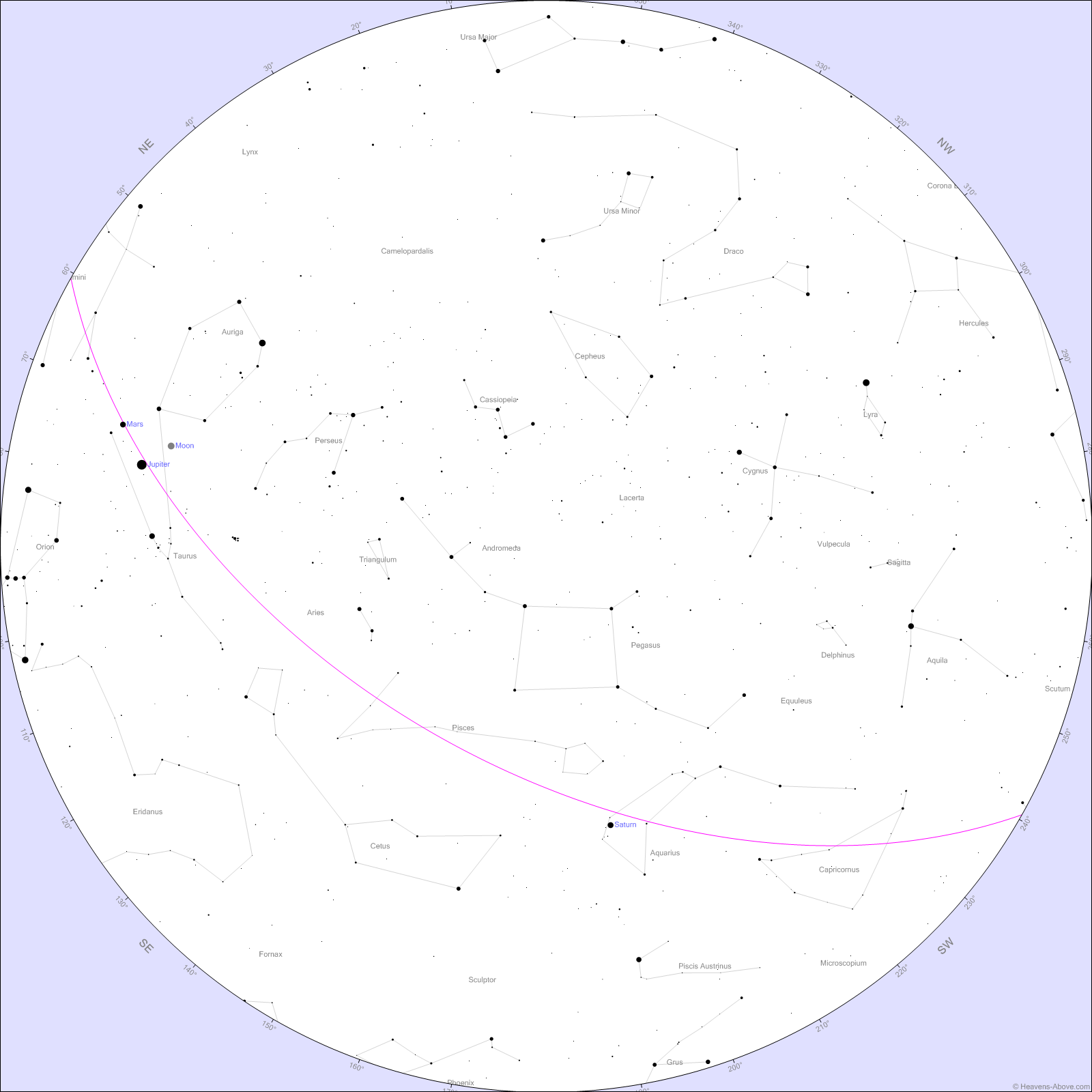 While you’re looking in that part of the sky, look upwards above Aldebaran, the red “eye” of Taurus and catch the Pleiades. Even in binoculars, this blue-hued open cluster is a stunner. Uranus is close by – look to the right of the Pleiades, and as always, you’ll need good binoculars or a scope to see it.
