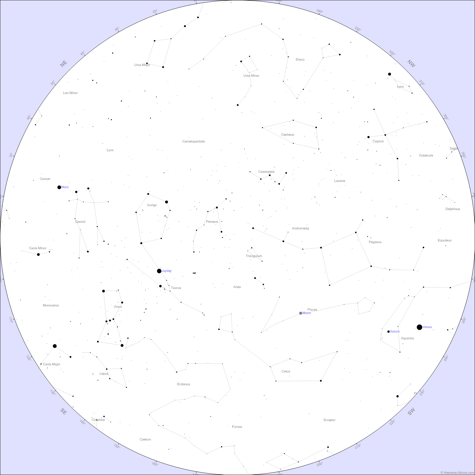 Look south to southeast to spot one of the most recognizable constellations in the sky: Orion the Hunter. Orion is easily identified by his famous “belt”—three bright stars almost evenly spaced in a row. If you see those three stars, you’ve got Orion.