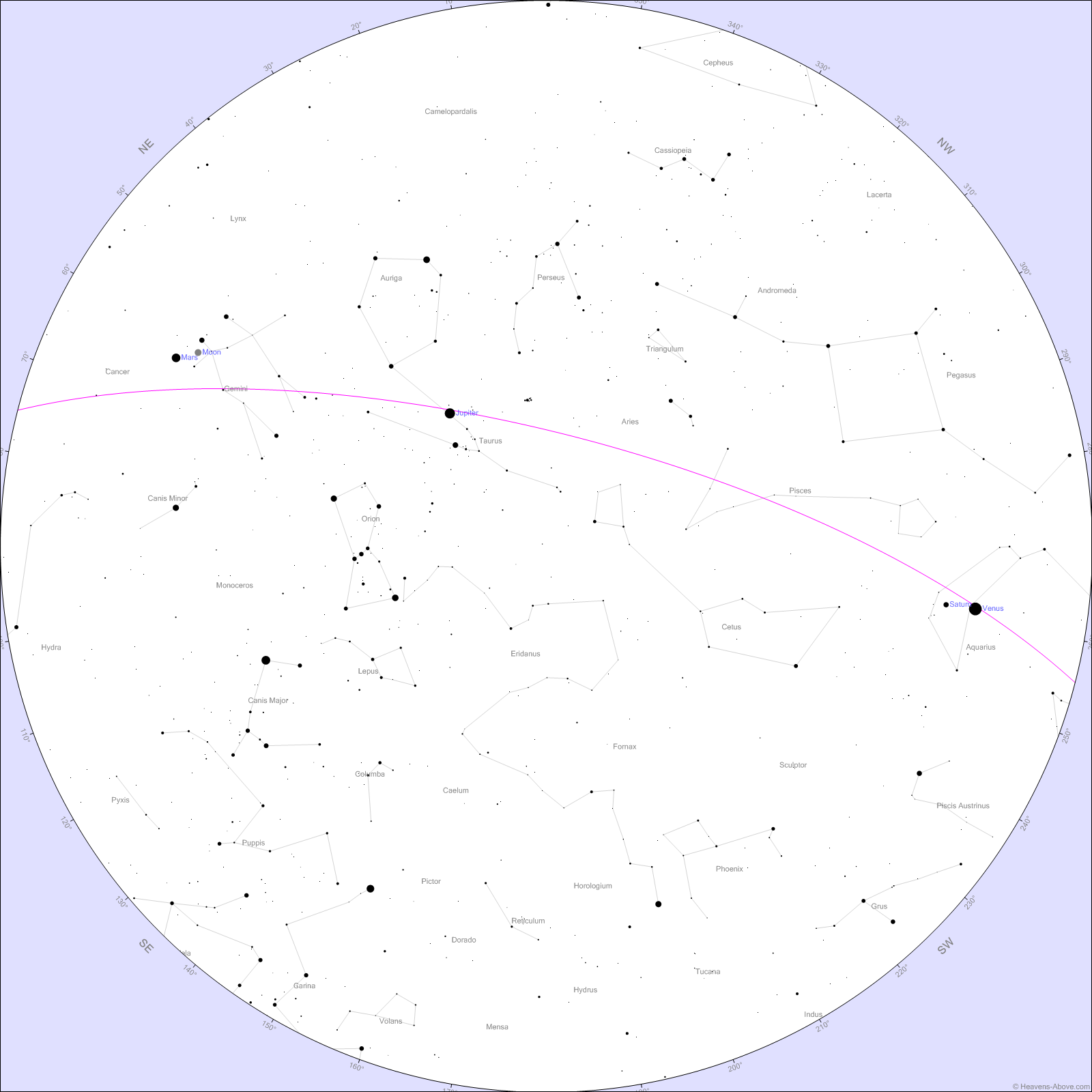If you pay attention to the positions of the planets, the Moon and the Sun, you might notice something peculiar. They all follow a similar path across the sky. For example, right now, the Moon, Saturn and Venus are roughly lined up in one part of the sky. If you were to draw a line through them, that line would arc across the sky to the opposite horizon, passing near Jupiter and Mars. The line that the planets follow is the ecliptic plane.