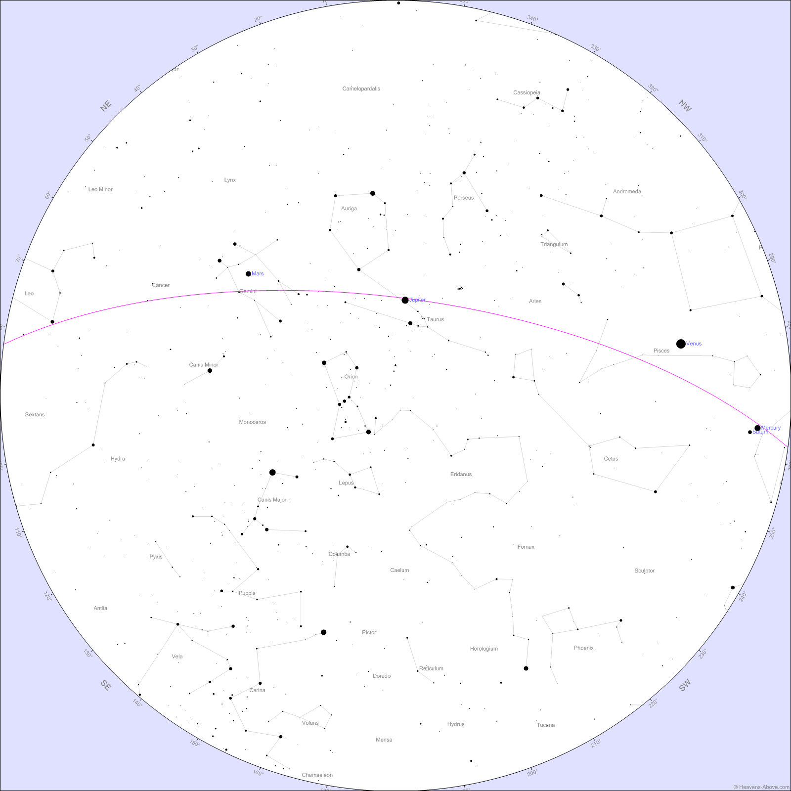 Mercury returns to our night skies this week, completing the parade of visible planets. Look for a close encounter between Mercury and Saturn, very low on the western horizon just after sunset on the 25th. The other planets are strewn out along the ecliptic plane. Venus remains in the west and extremely bright. Jupiter is still nearly directly overhead after sunset, and Mars is towards the east in Gemini.