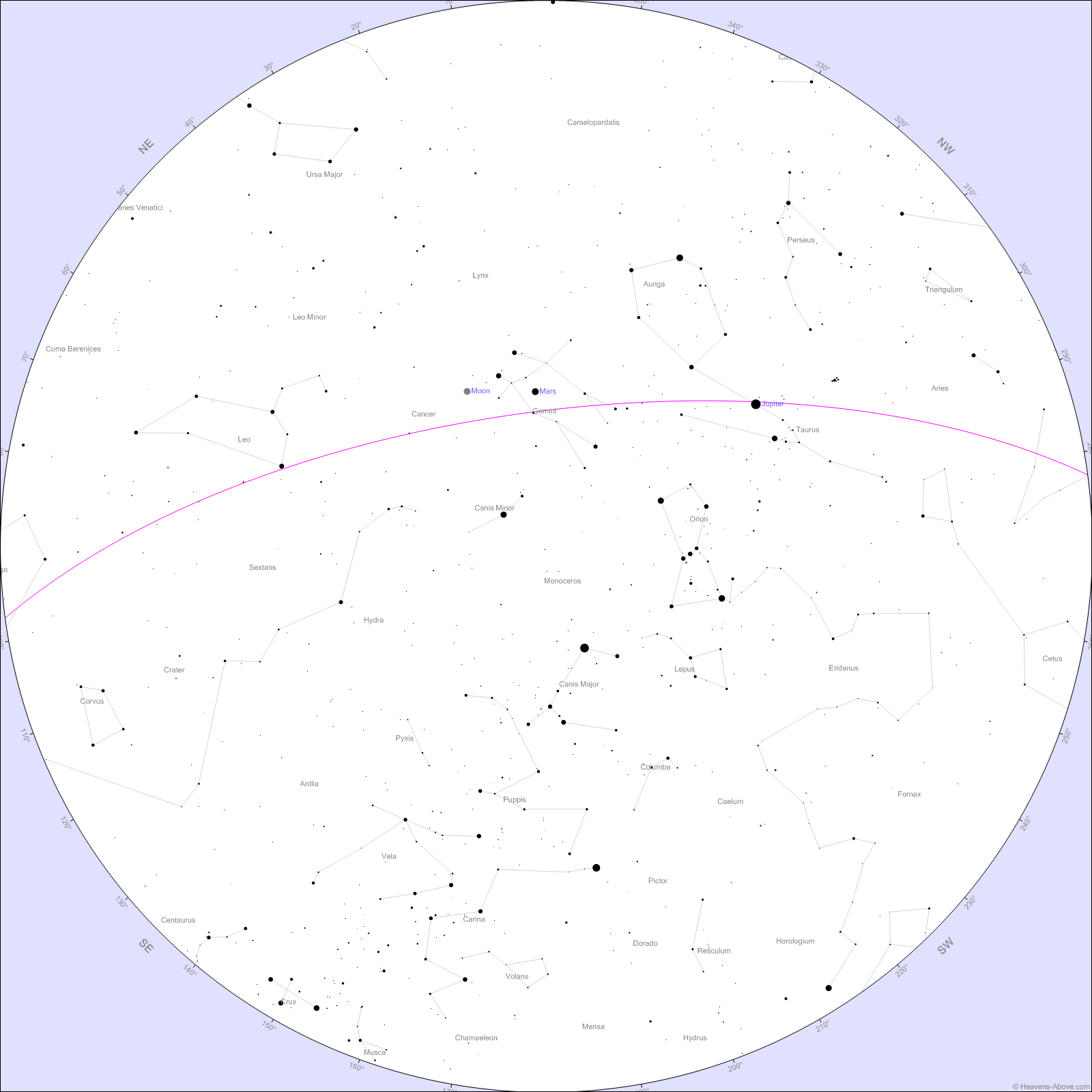 Mars is high in the sky in Gemini after sunset. Look for its reddish hue to distinguish it from nearby stars.