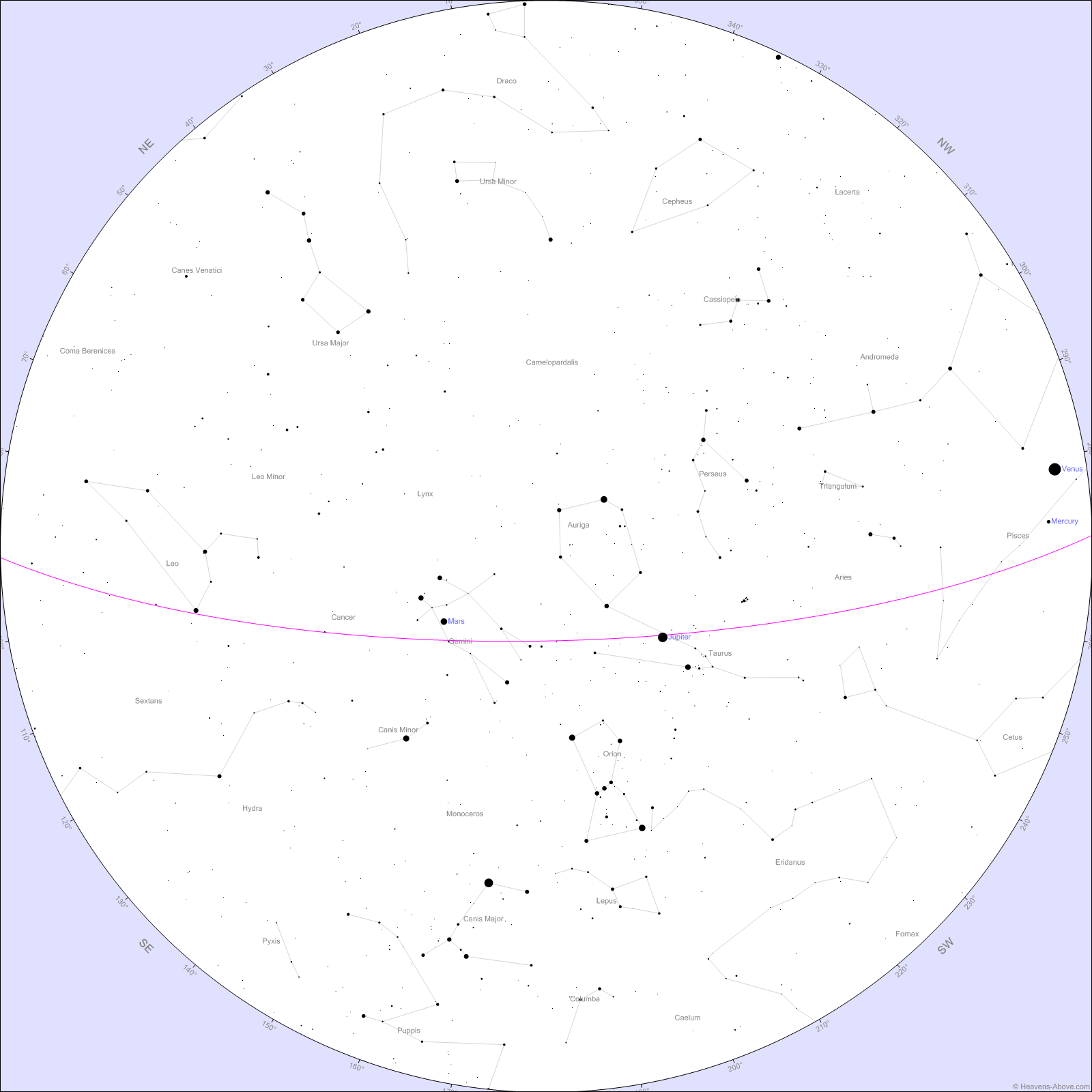 Mars is nearby, sitting in Gemini, close to the twin stars Castor and Pollux. Unlike the flickering glow of those stars, Mars has a distinct and constant reddish hue.