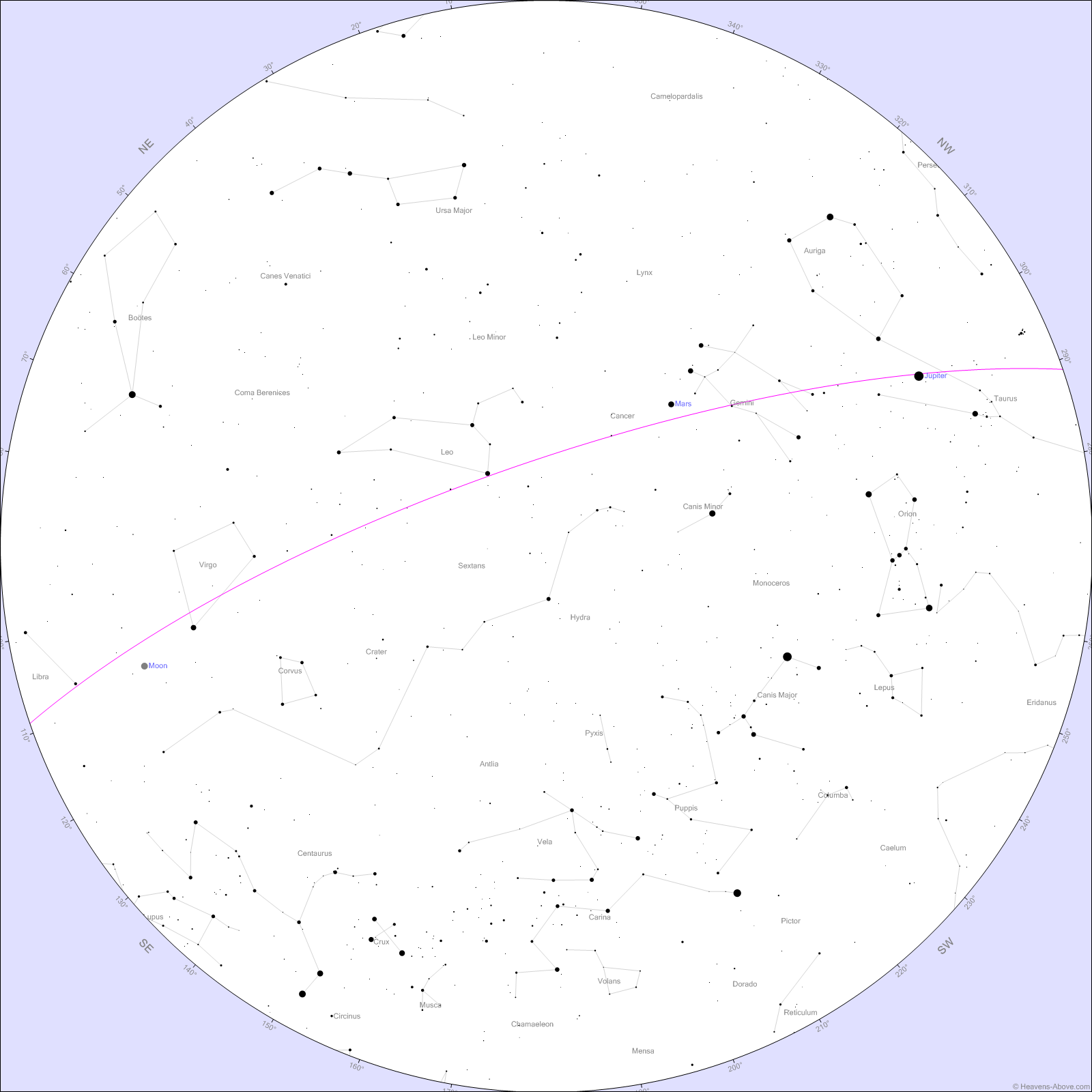 Jupiter still dominates the evening sky after sunset. Although the window to observe this gas giant narrows as the days lengthen, it’s still a magnificent sight in the western sky during twilight. Be sure to check it out in a telescope if you can. Depending on your instrument, you’re likely to see some cloud bands and its four Galilean moons.