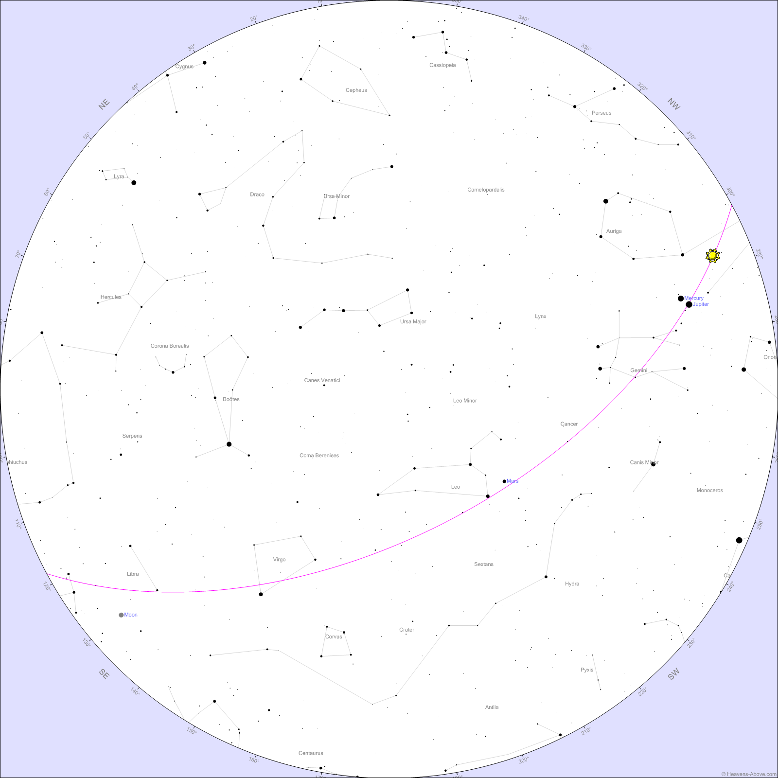 Visible in the early evenings during the first week of June, Jupiter shines low in the western sky after sunset. However, it quickly descends and becomes lost in the Sun’s glare as the month progresses.