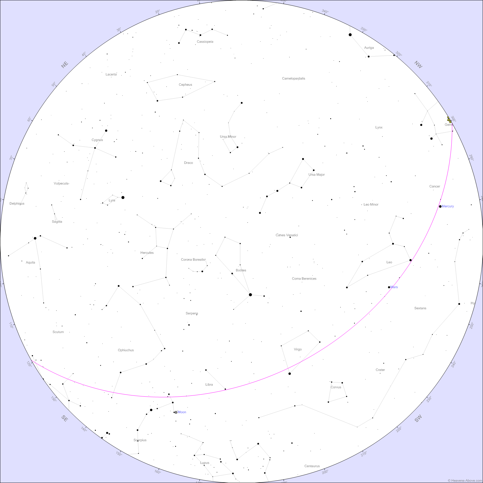 On to the planets. Mercury is hanging out low in the west-northwest just after sunset around magnitude .3, best seen early this week if you have a clear view of the horizon. Mars is hanging out in the west, still reddish, but fading into the twilight.